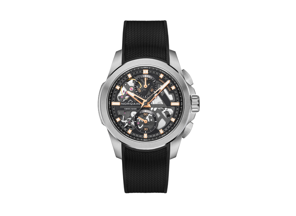 De Independence Skeleton Chrono wordt aangedreven door het NORQAIN 8K Manufacture Calibre, een exclusief, hoogwaardig skeleton flyback chronograafuurwerk, geïnspireerd op 's werelds hoogste bergen. Dit model is de eerste chronograaf in de Independence-collectie.