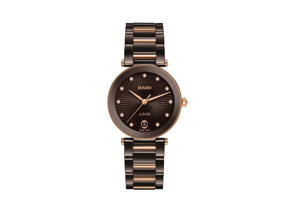 LaCoupole is een eerbetoon aan de iconen van weleer, heruitgevonden voor de verfijnde drager van vandaag. Een uiting van geraffineerde glamour, vervaardigd met de precisie en innovatie die alleen Rado kan bieden. De 31 mm monobloc kast van gepolijst bruin hightech keramiek wordt bekroond door een gewelfd saffierglas, omlijst door een bruin-roségoudkleurige gemetalliseerde rand. De kast is waterdicht tot 50 meter en combineert dagelijkse robuustheid met tijdloze elegantie. Het resultaat is een silhouet dat onmiskenbaar Rado is: strak, sculpturaal en tijdloos. De bruine wijzerplaat is voorzien van golvende markeringen gevuld met lak, wat een weelderig driedimensionaal effect creëert. De LaCoupole, vervaardigd uit gepolijst bruin hightech keramiek en verrijkt met roségoudkleurige PVD-gecoate elementen en sluiting, sluit perfect aan op het ontwerp en zorgt voor een harmonieuze uitstraling. De LaCoupole is een toonbeeld van elegantie: ontworpen om begeerd te worden en gemaakt om lang mee te gaan.